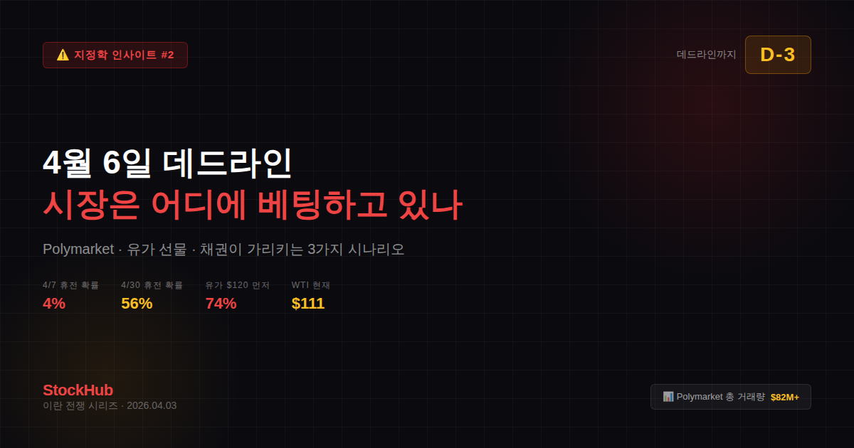 시장이 말하는 것을 그대로 읽으면 이렇습니다. 4/6에는 끝나지 않는다. 유가는 $120까지 더 간다. 하지만 4월 안에는 어떤 형태로든 합의가 나온다(56%).