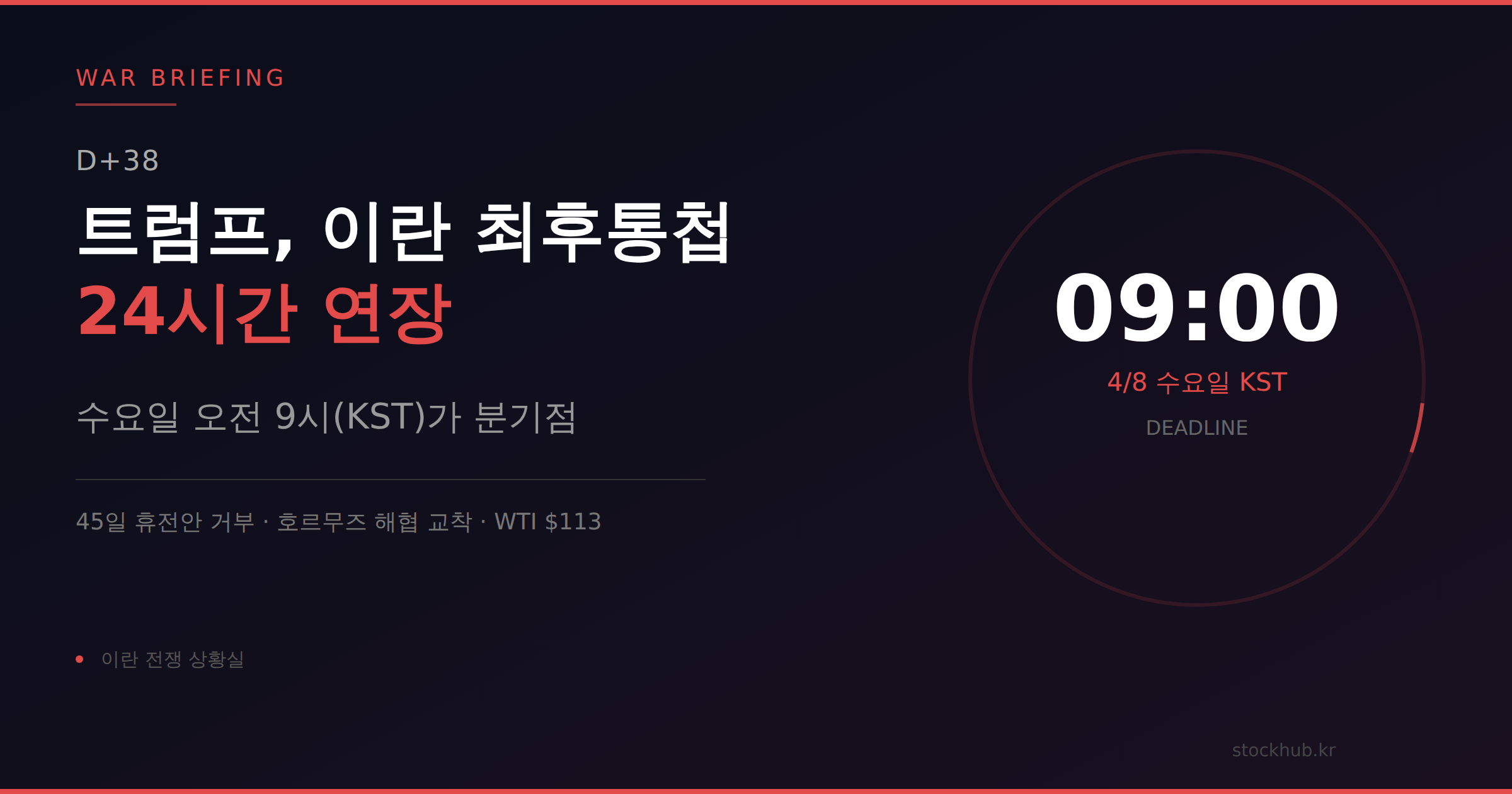 [전쟁 브리핑] D+38 — 트럼프, 이란 최후통첩 24시간 연장…수요일 오전 9시가 분기점